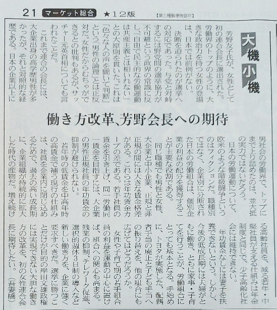 (追記)日経新聞の朝刊(2022年6月29日)の朝刊に、連合の芳野友子会長が取り上げられていました。連合による女性活躍推進、期待するところ大です。