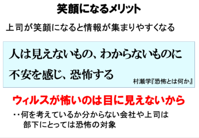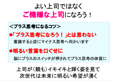 最初のメッセージは「ご機嫌な上司になろう!」。いきいきと働いている上司をみて、部下は未来に明るい希望が湧きます。