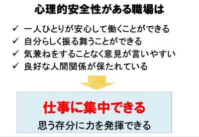 つづいて、心理的安全性について解説。職場の心理的安全性を高めると安心して働くことができて、職員は思う存分に力を発揮することができます。
