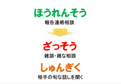 まずは、いまどきの職場コミュニケーションは「ほうれんそう」から「ざっそう(雑談・雑な相談)」が重要と伝え、受講者同士の雑談タイムでアイスブレイクをしました。