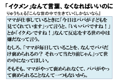 今回は育児介護休業法が改正されて男性の育休促進が進むことと合わせて、りゅうちぇるさんの「『イクメン』なんて言葉、なくなればいいのに」のメッセージを紹介しました。
