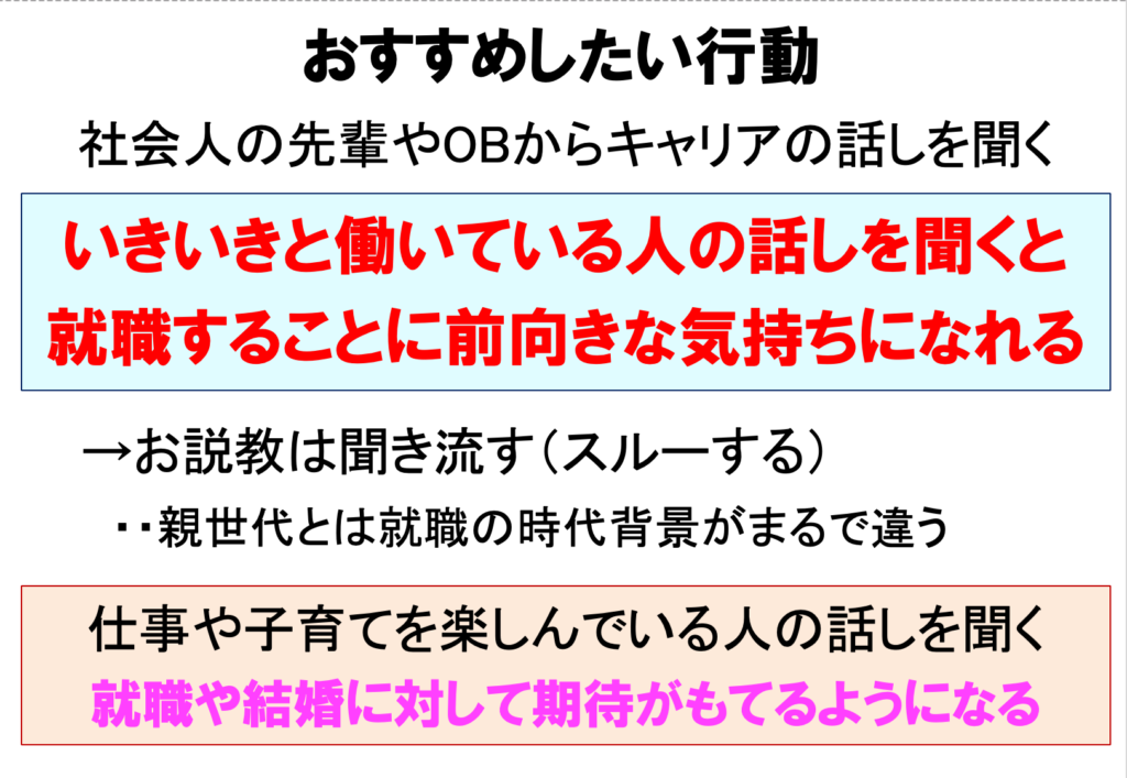 学生の皆さんが将来のキャリアに前向きな気持ちになってもらうには、いきいきと生きている人の話しを聞いてもらうのが有効と思っています。仕事も子育ても楽しんでいる人の事例として、私の体験談をしました。