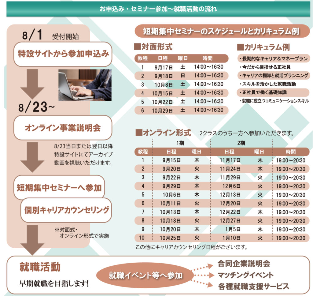 対象者は、川崎市在住在勤で、おおむね35才から50才の正規雇用の就職を目指している方。該当する方がいらしたら、ぜひ参加を検討してみてください。