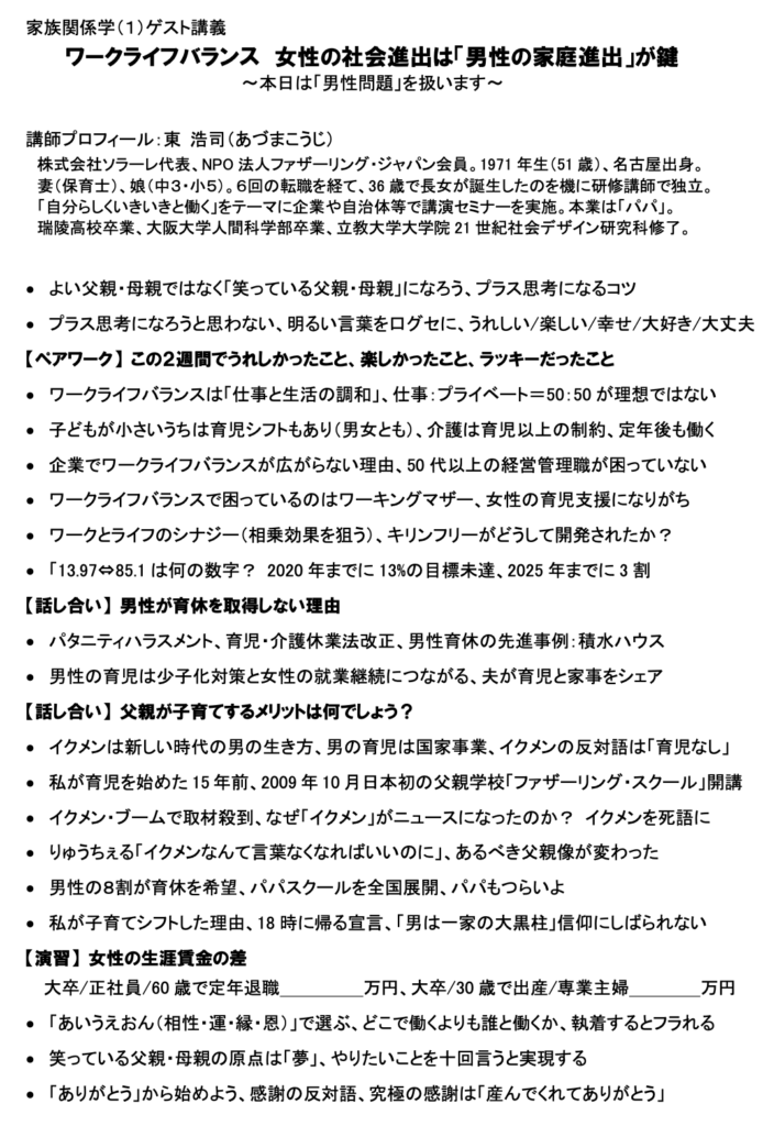 90分の授業で、参加型のワークも取り入れながら、盛り沢山の内容で臨みました。学生に配布したレジュメはこちら。