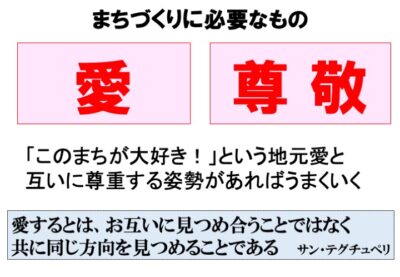 「まちづくり」について話し合うと、「まち」に抱くイメージが人によって異なるところがあると感じます。イメージのすり合わせは必要になりますが、異なっていたとしても「地元愛」と「相互尊重」があれば上手くいくとお伝えしました。