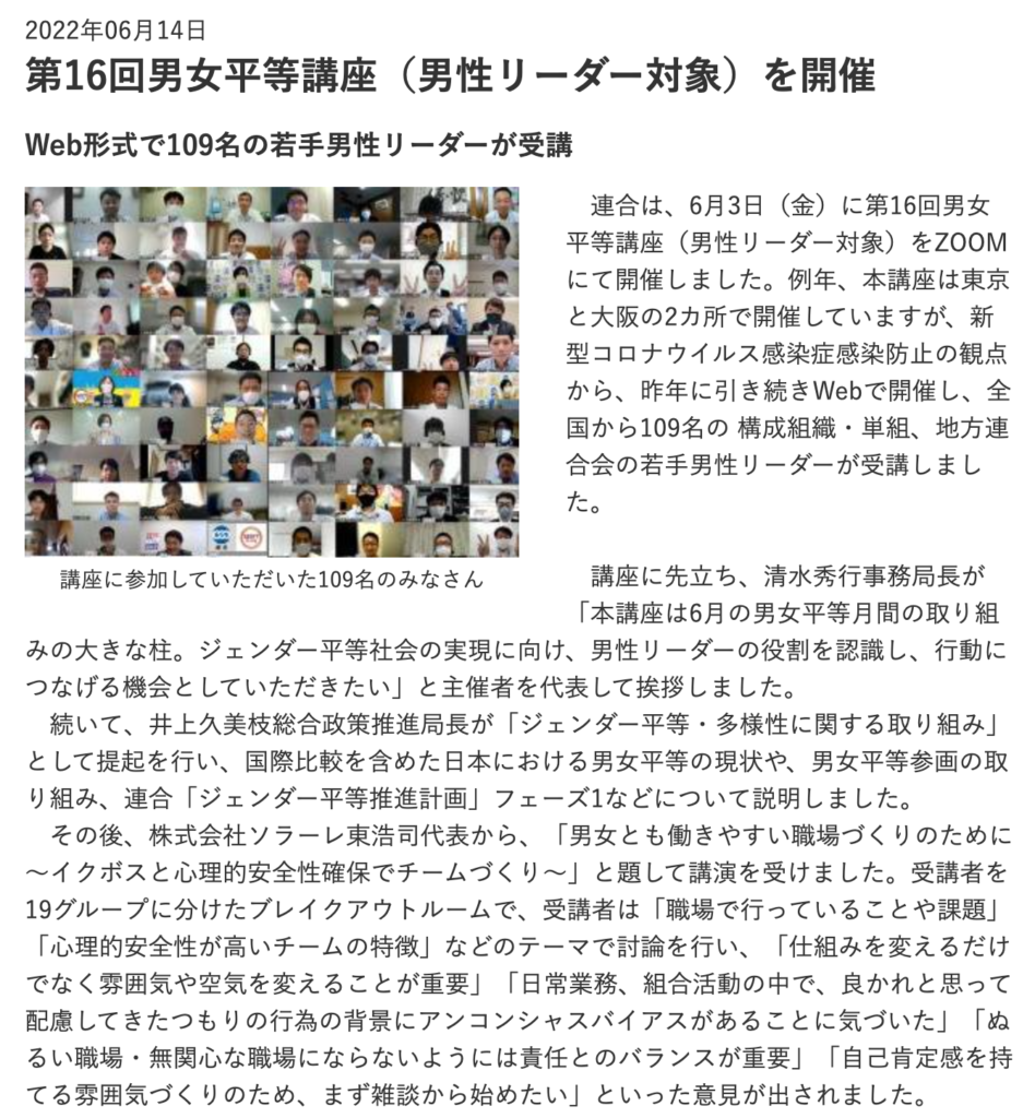アンケートでも沢山の感想と実践への意気込みが書かれていたのですが、連合ニュース(2022年6月14日)に掲載されたものから転載します。