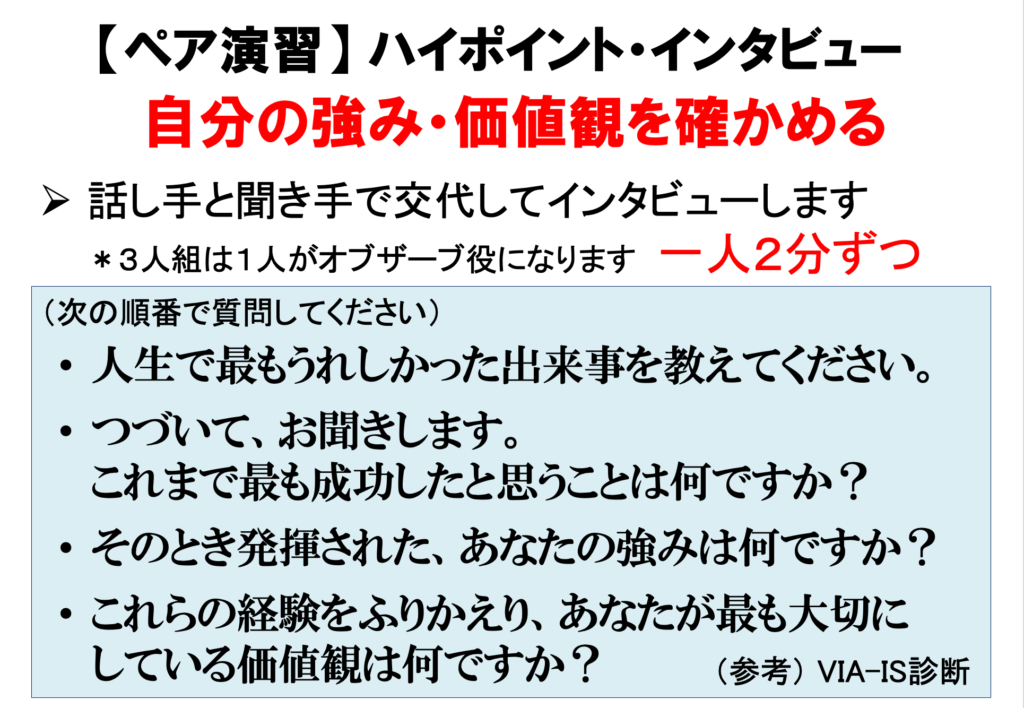 強みのワークは、ハイポイント・インタビュー。こちらの授業で前回インタビュー演習を実施済みで、学生皆さんの動きがスムーズでした。