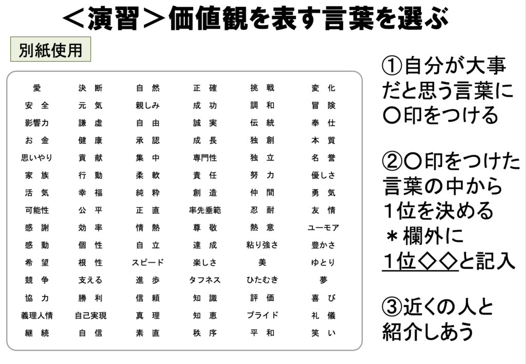 その後、価値観のワーク。私のオリジナル演習シートで、自分が大事だと思う言葉を選ぶ形で、自身の価値観を確かめるワークを行いました。