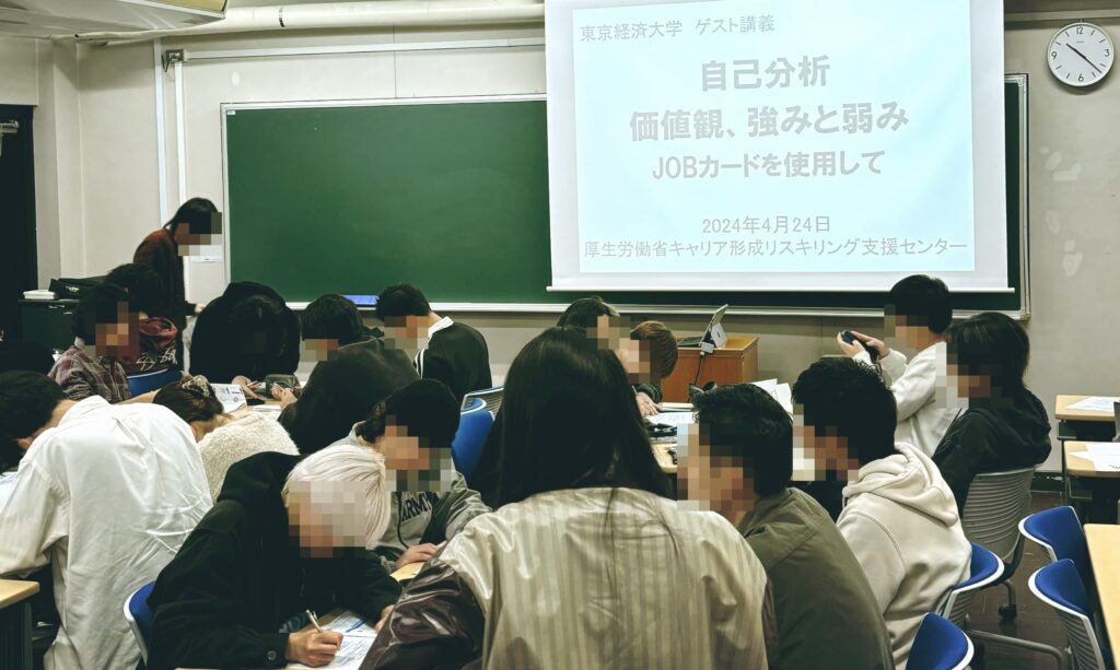 東経大の授業は今年で3年目。今回は、厚生労働省委託事業キャリア形成リスキリング支援推進事業による講師派遣で、大学生向けにJOBカードを使った自己分析を行う授業です。